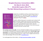Bangkok Now aka BNOW is hosting a networking luncheon on Thursday March 13th, 2014 from 11.00am to 1:30pm at the Foreign Correspondent Club of Thailand,www.fccthai.com, Maneeya Building, BTS Chidlom. Take advantage of the Early Bird Offer by booking and prepaying in advance for your seat and get a 10% discount. This offer is until March 6th 2014.